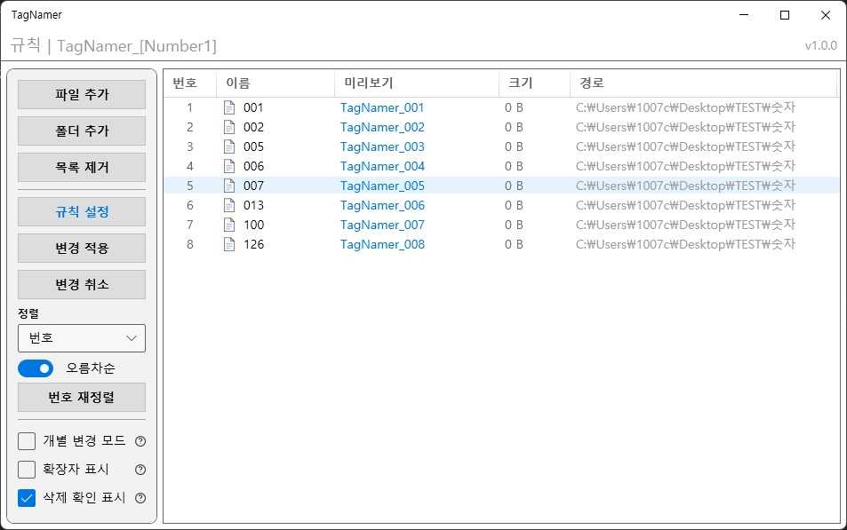 - 표 필수 항목: 번호, 이름, 변경될 이름, 크기, 경로